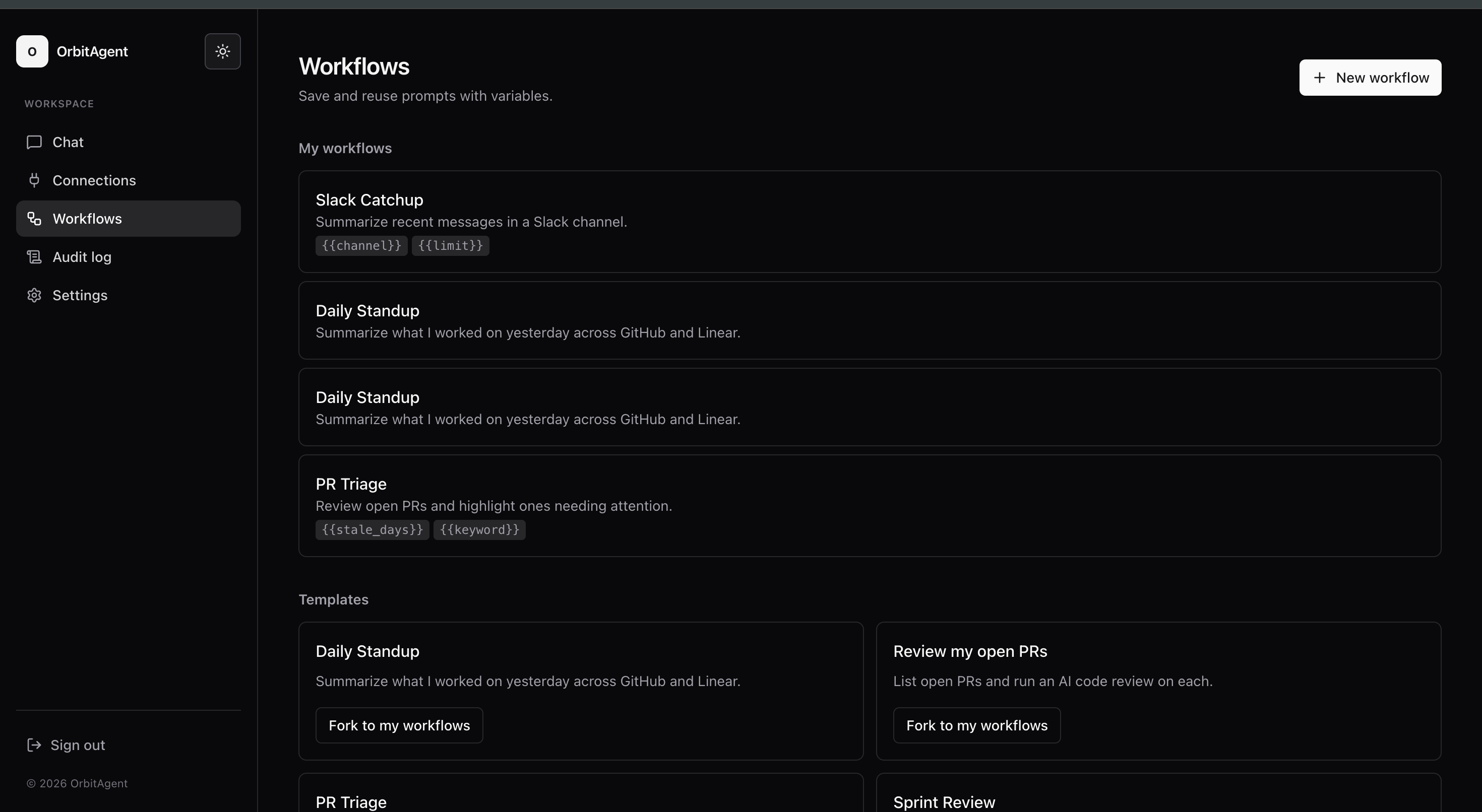Workflow engine with {{variable}} substitution and one-click reruns